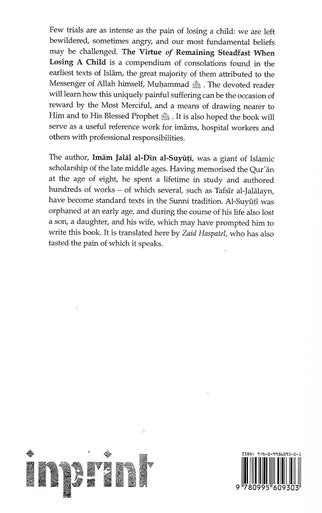 Few trials are as intense as the pain of losing a child: we are left bewildered, sometimes angry, and our most fundamental beliefs may be challenged. The Virtue of Remaining Steadfast When Losing a Child is a compendium of consolations found in the earliest texts of Islam, the great majority of them attributed to the Messenger of Allah himself. The devoted reader will learn how this uniquely painful suffering can be the occasion of reward by the Most Merciful, and a means of drawing nearer to Him and His Blessed Prophet. It is also hoped the book will serve as a useful reference work for; Imams, Hospital Workers and others with professional responsibilities. The translator has included an in-depth research of Imam al-Suyuti's biography in the book. Mufti Zaid Haspatel, a senior lecturer from Dar al-Uloom Zakariyya (South Africa) translated the book using four manuscripts. It is a translation of Imam Suyutis book with additional notes, index and an introduction. This is the first book on the topic in the English language. Al-Suyuti was orphaned at an early age, and during the course of his life also lost a son, a daughter and his wife, which may have prompted him to write this book. The translator has also tasted the pain of which it speaks.