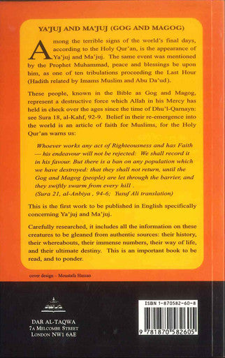 Among the terrible signs of the world's final days, according to the Holy Qur'an, is the appearance of Ya'juj and Ma'juj. The same event was also mentioned by the Prophet Muhammad, peace and blessings be upon him, as one of ten tribulations proceeding the Last Hour. These people, known in the Bible as Gog and Magog, represent a destructive force which ALLAH in his Mercy has held in check over the ages since the time of Dhu'I-Qarnayn: see Sura 18, al Kahf, 92-2. Belief in their re-emergence into the world is an article of faith for Muslims, for the Holy Qur'an warns us: "Whoever works any act of Righteousness and has faith his endeavour will not be rejected: We shall record it in his favour, but there is a ban on any population which we have destroyed: that they shall not return, until the Gog and Magog are let through the barrier and they swiftly swarm from every hill"?